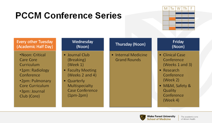 Fellows participate in several conferences and workshops to build their clinical and research skills. Fellow academic half-day occurs every other Tuesday, and additional conferences are held midday throughout the week. Workshops are scheduled throughout the year, usually on a Tuesday as well. Examples of workshops include Airway Management, ECMO, Mechanical Ventilation, Basic Bronchoscopy, Advanced Diagnostic Bronchoscopy, Pleural Disease Management, Introduction to Research, and Research Design Skills. A typical weekly schedule is shown below.